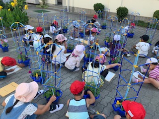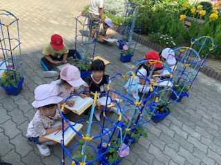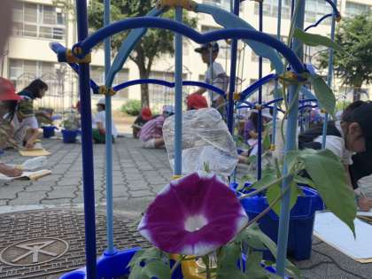 あれから数日!とうとう咲きました!朝顔たち!子どもたちも興奮してます!色とりどりの花たちが朝の中庭に咲き誇っています!子どもたちは丁寧に観察記録を描きました!
