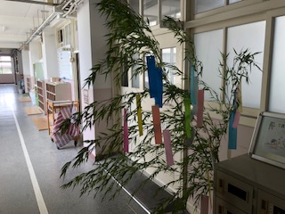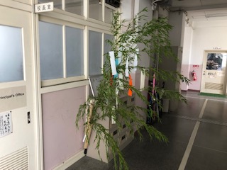 「プリキュアのふくがほしい!」「プーさんグッズがたくさんもらえますように!」「トミカほしい!」「ハムスターがほしい!」などなど、今校長室前の笹の葉には、願い事がぶら下がっています。