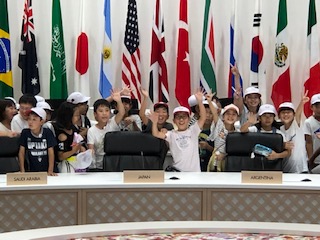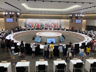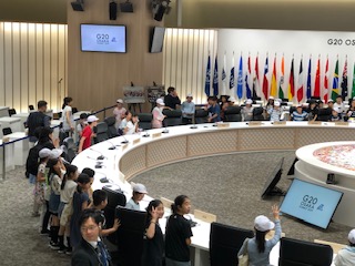 モニタールームでG20のまとめた映像を見たあとは、いよいよ本会議場へ向かいました。会場に入るやいなや、子どもたちは大興奮!「安倍さんとこ!」「トランプさん!」などなど、興奮しまくりでした!「フカフカやこの椅子」「このマイクでしゃべってたんや」などなど、好奇心がピークでした!