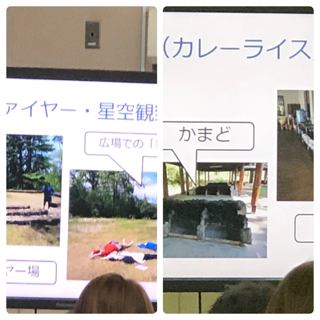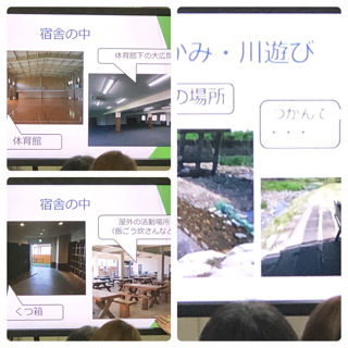 そして、スケジュールについてお伝えしました!ホテル内を順次、写真を交えてお伝えしました!当日貸切というラッキーな日程でした!焼き板づくりでは、ススが出ますのでご心配な方はマスクをご持参ください!また、夜の飯盒炊飯で白玉粉を使います!アレルギーで心配な方はご相談ください!翌日の朝食は自分たちでつくります!初チャレンジです!食材はカートンドッグというホットドッグのようなものです!ここで牛乳パックが1人2個必要になります!事前に回収しますのでご準備をお願いします!後日案内させていただきます。また、ご注意いただきたいのがナイロン製の衣服です!火を扱う場面もありますのでナイロン製の衣服は控えてください。川遊びでは「うわぐつ」が必要です!今使っているもので大丈夫です!大きなカバンはタイヤ付きのものは控えてください。虫よけや日焼け止めはできればスプレータイプは控えてください。最後に、現在お伝えしている「保険証のコピー」がまだ提出されていない方はご提出をお願いします。