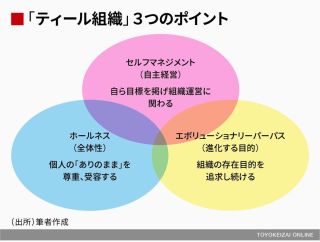 従来型の組織において人は評価される立場であるため、意識・無意識問わず「期待されている役割」を演じようとして自分の一部分しか見せず、本来の自分の能力や個性にふたをしているということがある。個人のありのまま(全体)を尊重し、受け入れることを重視するのがティール組織だ。