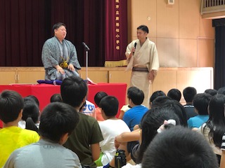 3、4時間目は落語との出会いです!笑福亭一門の森の石松さんと桂ざごばさんのお弟子さんの桂ちょうばさんのお二方が桜小学校に来ていただきました!