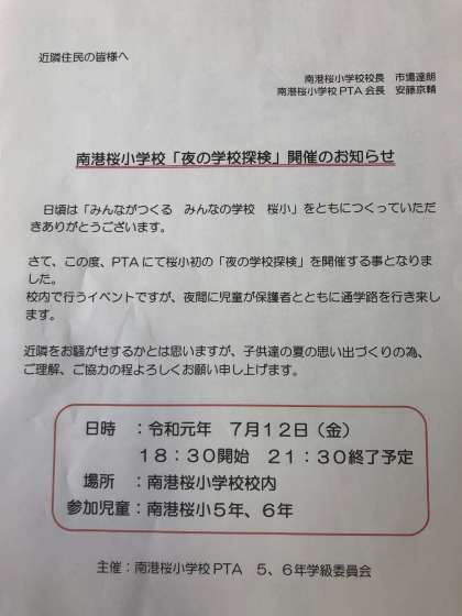 今年度PTAのチャレンジ企画第1弾!「夜の学校探検」がいよいよ来週末に開催されます。上記お知らせにもあるように夜の実施ということで、近隣のみなさまにはご迷惑をおかけする場合があるかと思います。どうぞ、子どもの夏の思い出づくりということで、ご理解とご協力をお願いします。