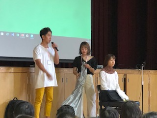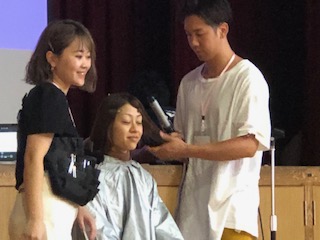カリスマ美容師が来ました!実演として、教職員がモニターとなり、ヘアーブローとメイクをしてもらいました!美容師の島田さんは、元キックボクサー??という異色の美容師さんです!しかも、来週からはアメリカに単身武者修行に行かれます!そんなバイタリティあふれた島田さんとの出会いにワクワクの子どもたちでした!またメイクアップには佐々木さんが担当されました!人を可愛く、美しくすることが小さい頃から大好きだった佐々木さん!お二人とも、この仕事の魅力は「笑顔」と「変われる」こと!さらに、子どもたちへのメッセージは「小さなことでも夢を持って!好きなことを見つけてほしい!」でした!とても素敵な、貴重な出会いの時間でした!ありがとうございました!