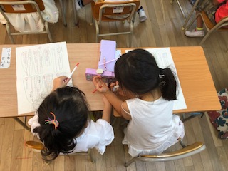 では、最後の質問?「引っ張っている人たちの体の大きさはだんだんどうなっていますか?」子どもたちは友だちと相談します!「だんだん小さくなっている!」じゃあ、「もしも、逆の順番で出てきたらどうなるでしょうか?」子どもたちの相談の声はさっきよりも大きくなります!「ネズミがこけちゃう!」「かぶにきずがつくだけ!」「ネズミが飛んでいくかもしれないから!」