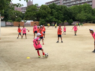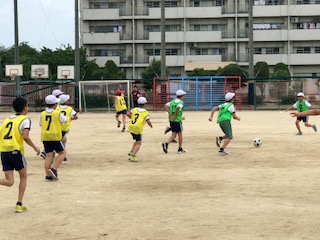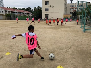 運動場では屋外スポーツクラブの子どもたちがボールを追いかけます!サッカーに興じる子どもたち!ゲーム形式の学びは一進一退の攻防に目が離せません!今にも雨が降りそうな空模様!最後までもってね!