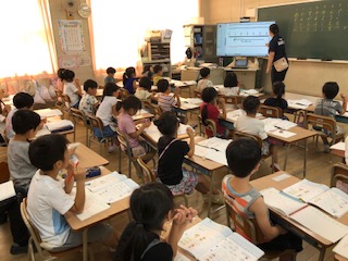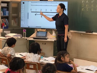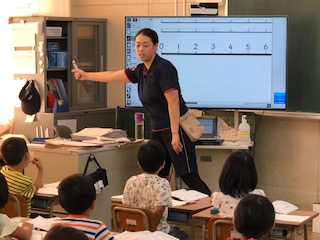 かずの線について学ぶ子どもたち!赤持って!5行目に!と声を揃えながら、大事なことを確認し合います。電子黒板を有効活用して、子どもたちにわかりやすく、見やすい学びを追求します!