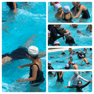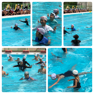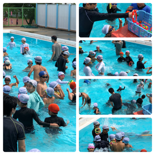 いよいよ水と戯れます!まずはカニに変身!1年生が見本を見せます!6年生は最初少し照れもありましたが、最後は見事にカニに成りきりました!次はクラゲになりました!6年生が浮き方を教えます!自分で見本を見せる子どももいます!ゴーグルが外れそうになると直してあげる優しい子どももいました!そして、いよいよ待ちに待った宝探し!門番先生の関門を突破して、宝を探す子どもたち!6年生は1年生のサポートにまわります!ペアで声をかけあって、宝探しは白熱しました!