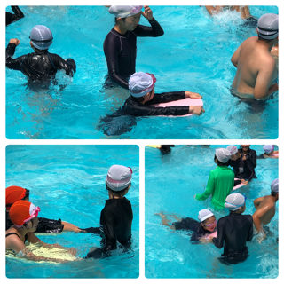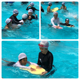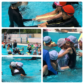 最後はみんなでワイワイ遊びました。6年生は1年生のみんなと仲良く遊び相手になってくれていました。ビート板で引っ張ってあげたり、おんぶして泳いであげたり、水かけあって喜ばせたり、それぞれが楽しめるように考えて行動できました。とてもステキな光景でした。ある6年生がボソッと言いました。「1年生に戻りたいなあ」と。なんで?と訊くと、「だって、カニさんしたいもん!もっと、自由に泳ぎたいもん!」と。泳力を高めることに重きを置きがちですが、子どもは純粋に泳ぎたい、遊びたいと思ってるんですよね。考えさせられる一言でした。と言いつつも、明日からは水泳特練になります。参加する子どもたちにとって少しでも泳力がつき、泳ぐのが楽しいと思える学びにつながればと思います。