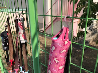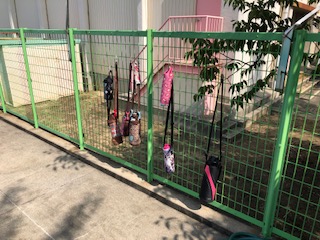 水泳学習中も水分補給は忘れません。その際、プールサイドに置いておくと、濡れてしまうので、それを克服するグッドアイデアがこれ!S字フックの活用です!なかなかいいでしょ!教職員のひらめきです!