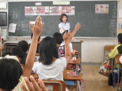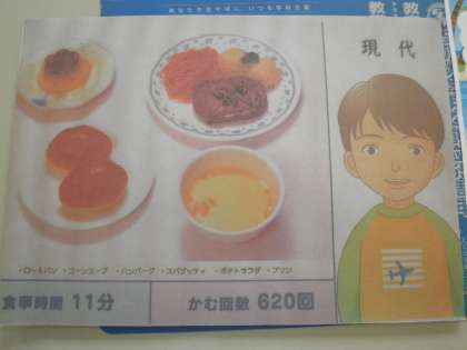 7月17日、6年生で「昔の食事に学ぼう」という学習をしました。社会の学習と関連させて、昔の食事は今の食事と比べて噛み応えのある食材が多いことを知り、噛むことの大切さを考える学習でした。