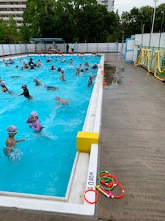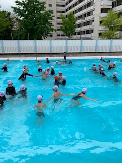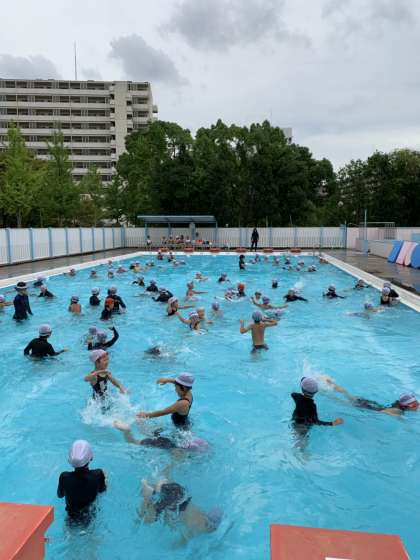 子どもたちは1学期最後の水泳学習をしています。今にも雨が降りそうな空模様の中、手つなぎ鬼ごっこや宝探しで水と戯れました。来週からの夏休みも1週間のプール開放があります。みなさんふるって参加しましょうね!