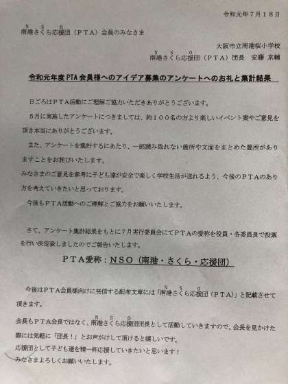 令和元年7月18日(木)PTA会員のみなさまへのお礼と集計結果