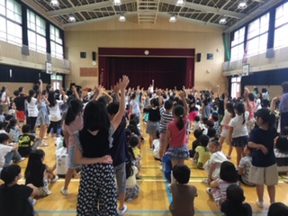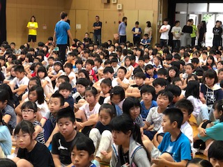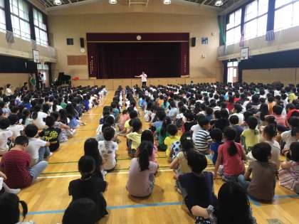 まだ梅雨があけきらない中、今学期の終業式が体育館で行われました。少しムッとする館内にこれから始める夏休みにワクワクしている子どもたちが集まりました。