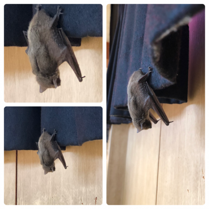 終業式が終わりを迎え、子どもたちがクラスに戻っている中、体育館内の窓に掛けられているカーテンの端になんだか怪しげな物体を発見!!!よく見ると、わかります?そうコウモリでした。どこから進入したのか。夜の内に行動して、今はぐっすりお休みモードでした。コウモリも終業式をいっしょに祝ってくれましたね。