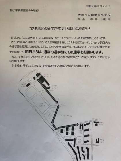 令和元年8月26日(月)コスモ地区の通学路変更「解除」のお知らせ
