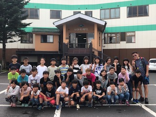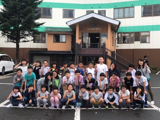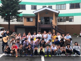 宿舎前で、みんなで記念撮影!ハイポーズ!雨も味方して止んでます!ラッキー!
