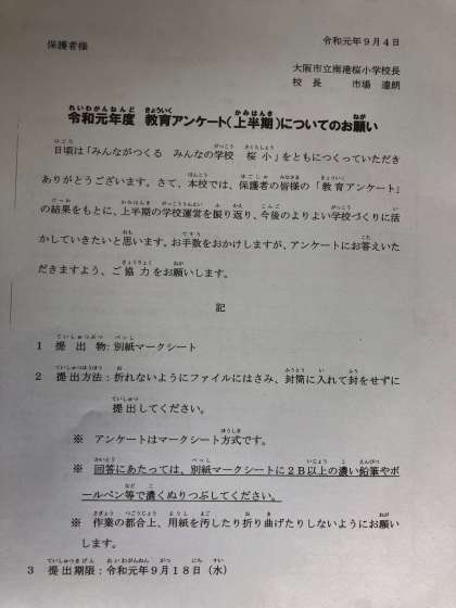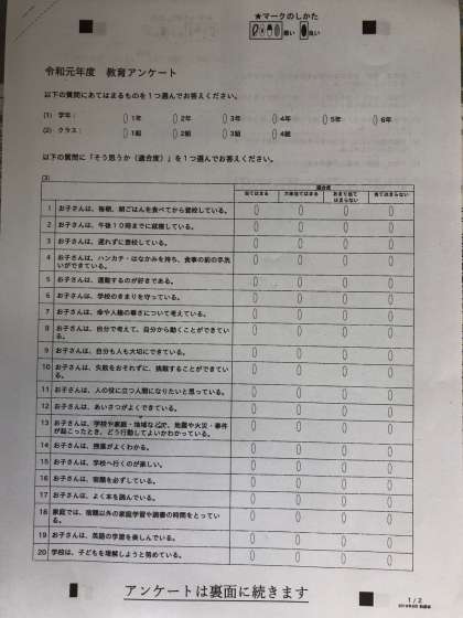 昨日子どもたちが持ち帰っています、今年度上半期の「教育アンケート」