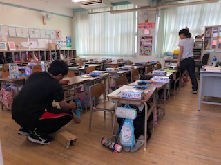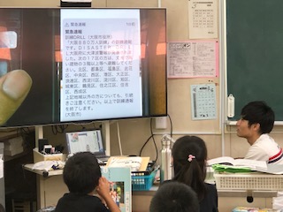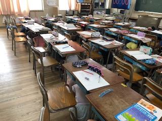 一斉緊急放送が鳴り響き、子どもたちは耳を澄まします。地震の情報とわかると、すぐさま机の下に隠れ、自分の身を守ります。どの教室にも緊張感が広がります。