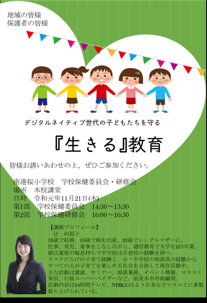 まだ先ですが、11月21日(木)に南港桜小学校にて「学校保健委員会」による学びの場「『生きる』教育」が開催されます!講師先生は数々のご経験から「生きるとは」を問い続けられ、マスコミに多数出演されている 辻 由起子 さんです。