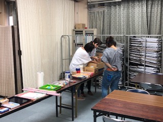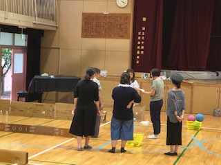 NSOのみなさんが明日の準備に入っています。体育館ではボーリング!多目的室ではひらめき工房!お土産準備!などなど、みなさんが子どもたちのために動いています。