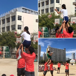 ラインアウト!ご存知ですよね!ワールドカップを見ていて、いろいろビックリしますが、このラインアウトはそのひとつ!あんなに重い人が、あんなに高く上がるなんて!!!子どもたちもこの体験に感動してました!