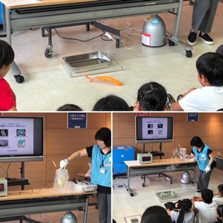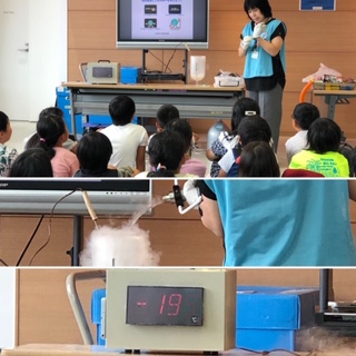 なんとマイナス195度!子どもたちもビックリ!冷凍庫はマイナス18度!ドライアイスはマイナス79度!あっという間に蒸発して、またまたビックリ!さらにハンカチを入れるとどうなるでしょう???あれ?変わらない!!!では、風船は???えーしぼんだ!そして外に出すと・・・元どおり膨らみました!じゃあカラーボールは?・・・砕けちゃいました!!!