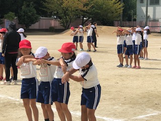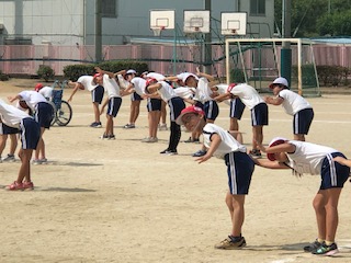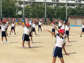 ノリノリのリズムで、子どもたちは笑顔でダンスの学習を学んでいます。台風の影響なのか、暑さが戻った感のある運動場!