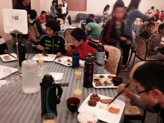 夕食は、バイキングでした。ご馳走いっぱいでみんなモリモリ食べていました。