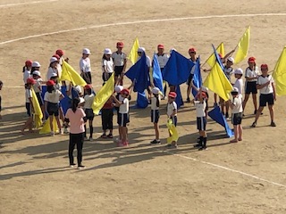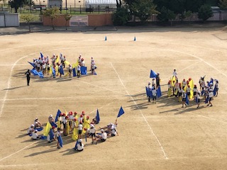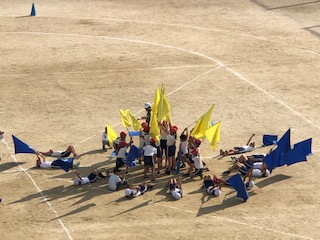 グランドに3つの大きな旗のモニュメントができあがります!それぞれに隊形に工夫がされています!これが実際音楽に合わせて、動くとどのようになるのか?楽しみですね!みんなの気持ちをどうひとつにするのか!ここからが見せ所です!