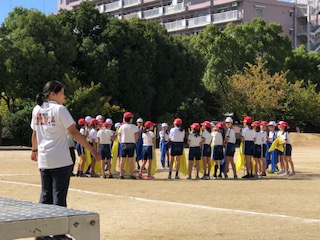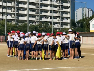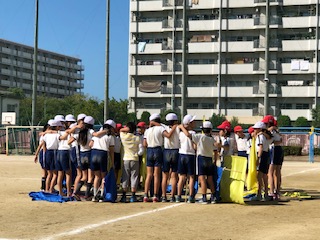 子どもたちは円陣を組んで、みんなの気持ちをひとつにします。運動会の目的は?それはみんなの気持ちをひとつにして、達成感や連帯感や成就感を体感することです。個人のできは重要視していません。それぞれが自分の持てる力を最大限に発揮できるかどうかです。友達のことを考え、行動できるかどうかです。失敗しても最後までやり通すことです。