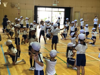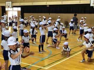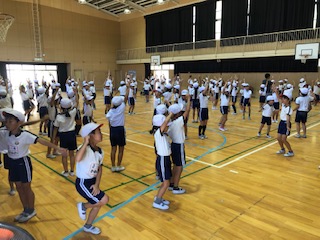 講堂内も外気気温同様に快適な環境です。子どもたちは、ダンスの細かい部分を修正しています。今日も笑顔が弾ける子どもたちです。
