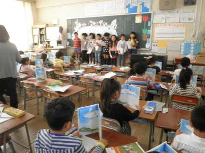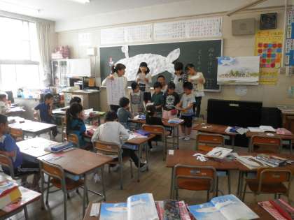 1年生は、国語科「くじらぐも」の学習をしました。くじらぐもに乗った子どもたちの様子を生き生きと読み取り、元気に音読していました。