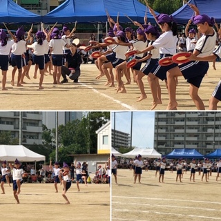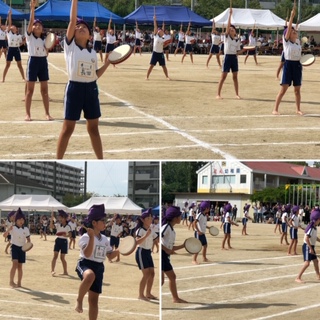 頭に巻いた紫色が運動場に、まるで紫菖蒲のように咲き誇っています!