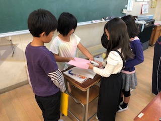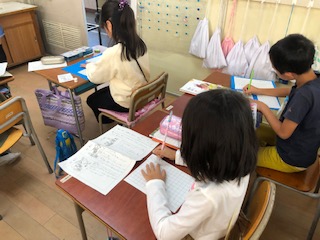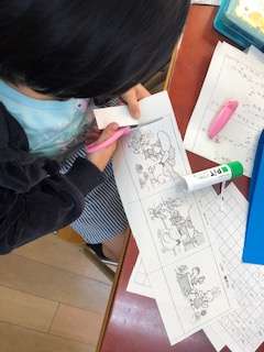 「絵を見てお話を作ろう!」をテーマに、子どもたちはオリジナルのお話作りをしています。絵を見て、想像したことを、しかも、順序よくメモにしていきます!そして、そのメモをもとにお話の世界を広げていきます!お話ができた人から、のりやホッチキスを使って製本します。
