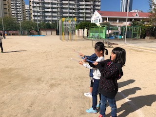 運動場から「ポン!ポン!」音がします。近寄ってみると、空気鉄砲で楽しむ子どもたち!「強く押してみて!」「あっ!飛んだ!」「いい音!」などなど、子どもたちは何度も何度も飽きずに鳴らし続けています!