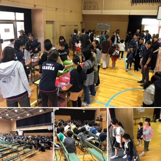 健康診断のために保護者のみなさんと一緒に体育館に集まります。子どもたちは少し緊張気味な様子!5、6年生のお兄ちゃんやお姉ちゃんが子どもたちの手を取ってサポートします。