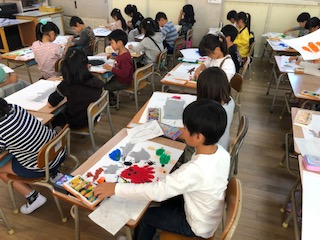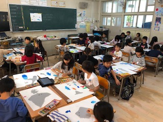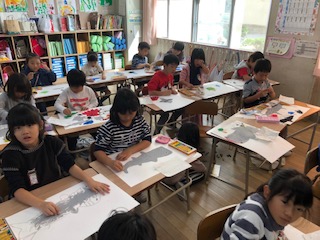 「ゆめのすいそう」づくりに子どもたちはニコニコしながら取り組んでいます!遠足で行った海遊館の写真を眺めながら、自分が描きたい魚たちを白いキャンバスに落とし込みます!