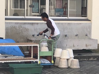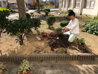 管理作業員さんたちが鉢植えの手入れをしています。聞いてみると、なんと!入学式のころに見頃になるであろう花たちを育てています!来年の春をイメージして、そこで咲き誇る花の生命の強さに感動しました!さらに、そのために今から育て上げようとする教職員の力に感銘しました!