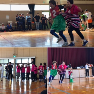大きなパンツに二人が入って、リレーで競います!