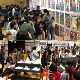 子どもと大人がひとつになって学べる空間がいいですね!絵画と工作を奇数と偶数学年で振り分けることで、講堂内に空きスペースが生まれ、大人数での鑑賞スペースが確保されました。この方式で毎年作品展を実施していく予定です!