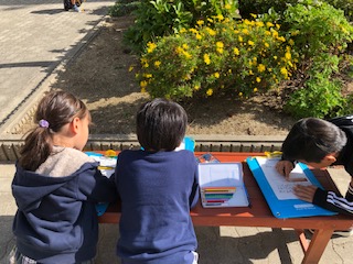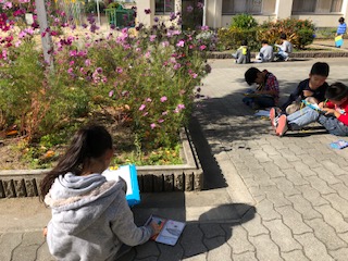 子どもたちは中庭の花々をスケッチしています!色鉛筆を駆使しながら、上手に自分らしく描いていました。