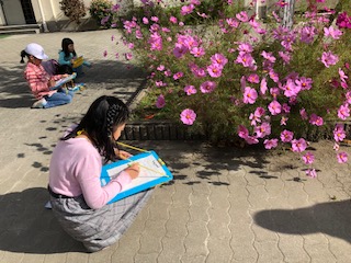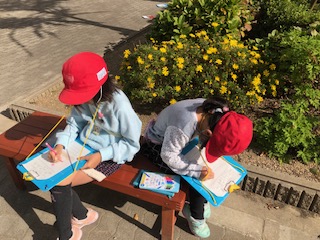 日差しが照りつけるとポカポカ陽気!風が吹くとブルブル寒気!の寒暖差のばげしい中庭では、子どもたちが色鉛筆片手に、花たちをスケッチしています!