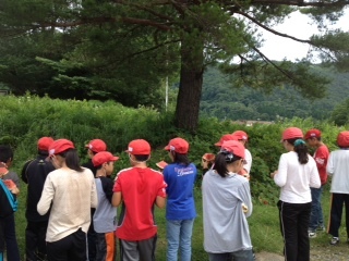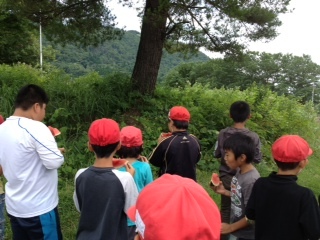 雨が止むのを待って、高丸山へ登山に出発しました。曇り空でしたが、風が、爽やかでした。登り終えて、宿舎の方が用意してくださったスイカは甘く冷たくてとても美味しかったです。みんなで種とばしをして、楽しい思い出をつくりました。