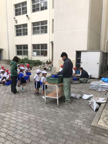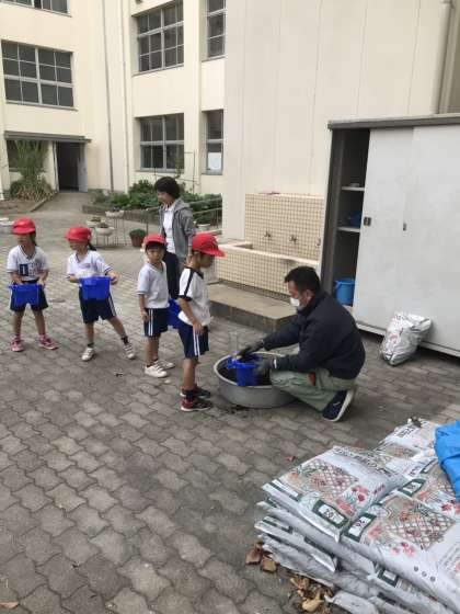 管理作業員のお二人が子どもたちと学びをつくります!肥えた土を一人一人の鉢植えに入れたミニ畑にチューリップの球根を優しく眠らせます!土のお布団をかけてあげ、芽が出るのを待ちます!