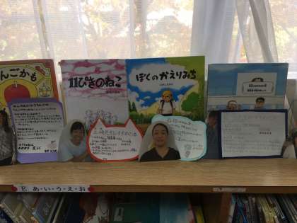 図書委員会の児童が、先生のオススメの本をインタビューし、図書室に展示しました。これからもしばらく図書室に展示しています。
