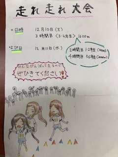 1年生はインフルエンザ等かぜ様疾患が増えましたので、本日の走れ走れは延期とします。