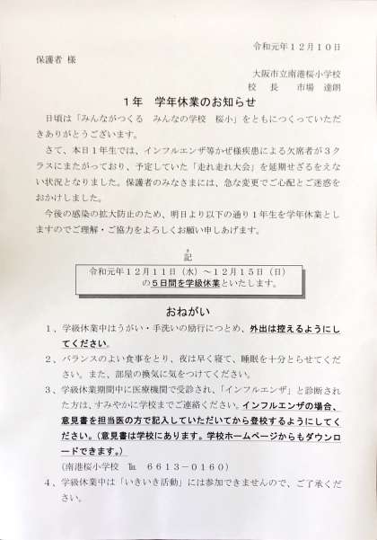 上記お手紙の通り、本日1年生のインフルエンザ等かぜ様疾患の子どもが急激に増えました。本日の「走れ走れ大会」の延期と、明日以降日曜日までの5日間の「学年休業」を決定せざる得ない状況となり、これ以上の感染拡大の防止として判断しました。