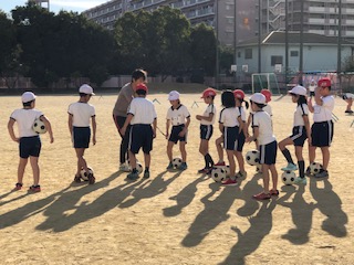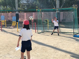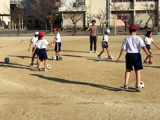 外は意外と気温が高め。運動場では子どもたちがボールを蹴りあいながら学習しています。一対一のボールの奪い合いや、ゴールに向かってのシュートなど、子どもたちの真剣な姿が見られました。