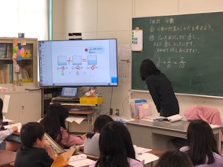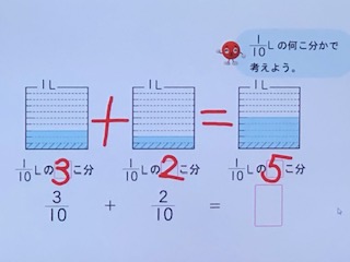 分数のたしざんにチャレンジしている子どもたち!電子黒板を使って、10個に分けたうちのいくつ分の考え方を学んでいます。子どもたちは画面から、分量を見つけ、見分けて答えを導きました!
